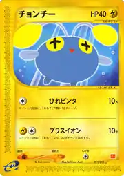 Chinchou (Japanese: チョンチー Chonchie) is a Lightning-type Basic Pokémon card. It is part of the McDonald's Pokémon-e Minimum Pack.