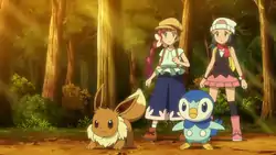In Nightfall? Nightmares!, Eevee traveled with Chloe to Sinnoh. During the trip, Eevee showed a bit of interest in Pokémon Contests, which led to Chloe deciding to head to Eterna City. Along the way, Eevee and Chloe decided to camp out in a forest and ended up meeting Dawn and Piplup. Overnight, Eevee ended up quickly befriending the Penguin Pokémon. The next day, in the middle of an argument between Dawn and Chloe, a wild Rhydon appeared on their path and attacked them. During the battle, Eevee managed to defeat Rhydon after copying Piplup's Bubble Beam.