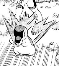 Cyndaquil's known moves are Ember, Smokescreen, Quick Attack, and Flame Wheel. It has also used Tri Attack by combining its attacks with Gold's Croconaw's and Pikachu's. | ||