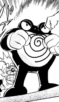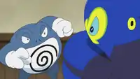 Poliwrath dodged Pikachu's Thunderbolt attack three times until it was hit by the fourth one. It then managed to hold off Pikachu's Quick Attack, focusing its energy and then using Double Slap, knocking Pikachu out. Ash then chose Bayleef, and Chuck issued Poliwrath to use Water Gun, which Bayleef dodged. Ash then ordered Bayleef to use Razor Leaf and Vine Whip, which slammed Poliwrath to the ground. Chuck ordered Poliwrath to focus its energy, and while Poliwrath was wobbling, trying to stand up straight, Bayleef used Body Slam to defeat Poliwrath. Poliwrath reappeared in Octo-Gridlock at the Gym!, where it battled Bea and her Grapploct. It later watched her World Coronation Series rematch against Ash. Poliwrath's known moves are Double Slap, Water Gun, and Poison Jab. | ||
