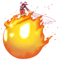 As Gigantamax Cinderace, it has become larger with a few alterations. The white ears have become longer, and their yellow insides have extended. It rides on a Pyro Ball that became a giant orange fireball due to Gigantamaxing. The fireball can sometimes exceed to a size of 300 feet. Its fireball has a white nose and eyes. Several fire-like ears can be seen around the head. A crest shaped like a fiery bird is located on top of the fireball's head. Three red clouds float above Gigantamax Cinderace.