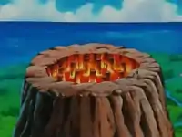 There is a volcano on Cinnabar Island which gives it its name. In Generation I and Generation III, the volcano that appears on Cinnabar Island cannot be accessed. In the anime, the volcano is a prominent feature of the island, and is where the Cinnabar Gym is located, split into two sections. One is inside of the volcano, and has an arena suspended over the lava inside one of the chambers, while the other is atop the volcano's crater. In Generation II and IV, three years after the events of Generation I and III, the volcano erupted on the island, destroying everything, and only the Pokémon Center has been rebuilt. What appeared to be a rain-filled crater could also be seen in Pokémon Gold, Silver, and Crystal. In HeartGold and SoulSilver, the exterior of the volcano can be scaled with Rock Climb. When comparing the maps of generations I/III and II/IV, it can be seen that the volcano originated where the Gym once stood. On the other hand however, the official Kanto artwork map for Pokémon: Let's Go, Pikachu! and Let's Go, Eevee! depicts Cinnabar Island's volcano as being to the west of the Cinnabar Lab and Pokémon Mansion, on a new extension to the island not seen before.