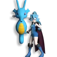Clair's design is based on her appearance in Pokémon HeartGold and SoulSilver. Kingdra is Clair's signature Pokémon in the core series games. Kingdra's Dex entry comes from Pokémon Ruby and Pokémon Omega Ruby.