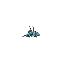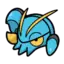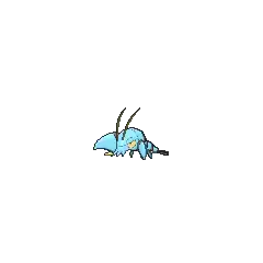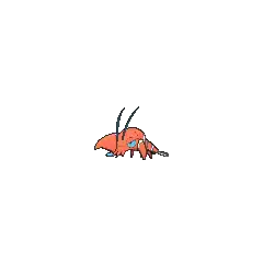 Clauncher is a crustacean Pokémon that resembles a bright blue shrimp. It has three pairs of light gray legs; two pairs have simple blue spikes, while the foremost pair forms a larger set of claws. One claw forms a single, sharp point and the other is much larger and forms a more traditional pincer with a tiny yellow claw. Each front claw has a black stripe across the top. It has a pair of yellow antennae on top of its head, yellow eyes, and three pointed mandibles. There are three black stripes along its back that separate its body into segments, and it has a light gray underside. Two black, rectangular fins form its tail.