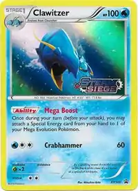 Clawitzer (Japanese: ブロスター Bloster) is a Water-type Stage 1 Pokémon card. It was first released as part of the Steam Siege expansion.