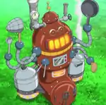 An invention made for cooking. It has an oven, a microwave, cooking pots, a frying pan, a cooking spoon, cutlery and a net with an unknown function. It also sports glasses, presumably to make it look like Clemont. It is used to cook for Ash and his friends on their journey and was first shown when Clemont showed it to Lilia. | A Keeper for Keeps? | ✔ Success |