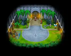 Using the time-travel monument located in western Cocona Village, which was the Cocona Plaza in the past, Celebi will send the player back in time to past Cocona Village. One major difference between past and present Cocona Village is the gate on the northern-end of past Cocona Village, which appears as a pile of ruins in present Cocona Village. The gate connects to a part of Teakwood Forest that the player is unable to explore in the present and leads to a warp-point to any of seven temples in the past and participate in Wireless Multiplayer Missions, courtesy of Kira. The temples were built to worship Arceus.