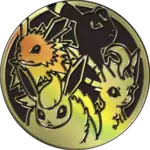 Description:Extra-large-sized, Gold Rainbow Holofoil, Black-backed Coin featuring Jolteon, Flareon, Umbreon, and Leafeon released within the Evolving Skies Pokémon Center Elite Trainer Box August 27, 2021