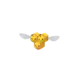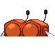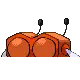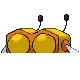 Combee is a small, flying, insectoid Pokémon. Its body consists of three orange, hexagonal sections that resemble honeycomb cells, arranged with two hexagons on top and the remaining hexagon between and below them. Each hexagon has a round, yellow face with two black, oval eyes and a black, curved mouth. In the middle of their foreheads, the upper two faces each have a single whisker-thin, black antenna with black, oval tips approximately the size of their eyes. They also each have a translucent, rounded-triangle-shaped wing connected to an orange, domed joint on their sides. The backsides of the upper faces are yellow and rounded, as the sides of a sphere. The bottom face is the main thinker of the three, and it is also the only one to have a full, insectoid abdomen. This abdomen is yellow near the tip with a thick, black stripe close to its hexagonal frame. Female Combee have red, wedge-shaped spots on the foreheads of their lower faces, just below the point where all three faces meet; male Combee have no distinct markings in this area.