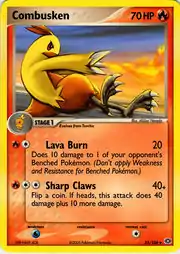 Combusken (Japanese: ワカシャモ Wakasyamo) is a Fire-type Stage 1 Pokémon card. It is part of the EX Emerald expansion.