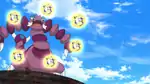 Regigigas's body becomes surrounded in a maroon aura and the braille pattern on its face glows the same color. The opponent's eyes then glow red and Regigigas can control them. | ||