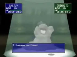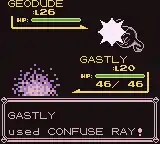Haunter charges an orange ball of energy in its hands, then shoots it at the opponent. The opponent's eyes turn red and it gets confused; or, Haunter fires a purple circle of energy from its eyes towards the opponent, confusing it. | ||