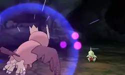 The leaves on Oranguru's fan glow purple and it thrusts it forward, causing the target to briefly become outlined in a purple glow, confusing it. | ||