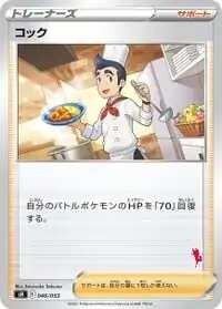 Cook was introduced as a Supporter card in the Pokémon Trading Card Game during the English Sword & Shield Series (the Japanese Sword & Shield Era). It was first released in the Japanese Sword & Shield Family Pokémon Card Game expansion before debuting in English in the Fusion Strike expansion, with an illustration by Sanosuke Sakuma. It allows the player to heal 70 damage from their Active Pokémon.