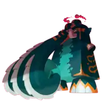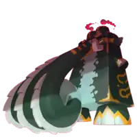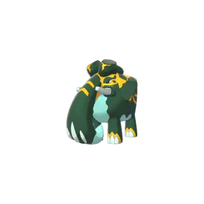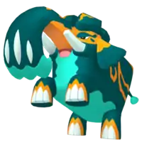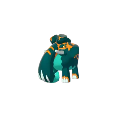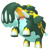 Copperajah is a large, elephantine Pokémon with a dark green body and a light teal underbelly. Pokédex entries for its pre-evolution Cufant suggest that this coloration probably results from the tarnishing of copper in its skin over time. Untarnished copper accents cover most of Copperajah's face, and pattern its ears, feet, trunk, and back. It has short, blunt tusks and a long, broad, muscular trunk that ends in three claw-like protrusions. It has three raised, white ridges on the dorsal end of its trunk, and several rocky protrusions on the dome of its skull.