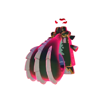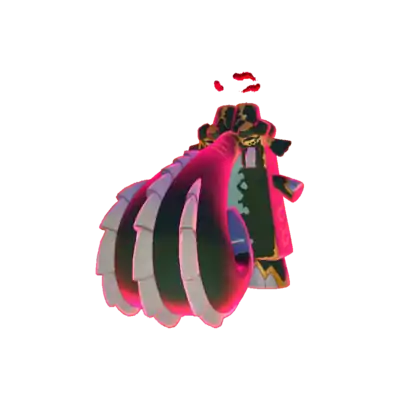 When it Gigantamaxes, Copperajah's trunk enlarges, its body becomes block-like, and it adopts a bipedal posture, standing on its large hind feet. Its rectangular tusks angle upward and the raised bumps on its trunk extend into overlapping, serrated ridges. Clouds of Dynamax energy float above its head. While Gigantamaxed, Copperajah's trunk is powerful enough to level mountains and obliterate large structures. Gigantamax Copperajah is the only known Pokémon capable of using the exclusive G-Max Move G-Max Steelsurge.