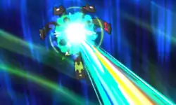 Zygarde Complete Forme opens the mouth on its chest and forms an orb of energy in front of it. It then fires a beam of multicolored energy from the orb at the ground underneath the opponent, forming a light green Z-shape. The ground around the Z-shape then explodes. | ||