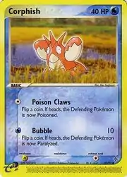 Corphish (Japanese: ヘイガニ Heigani) is a Water-type Basic Pokémon card. It is part of the EX Dragon expansion.