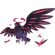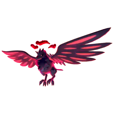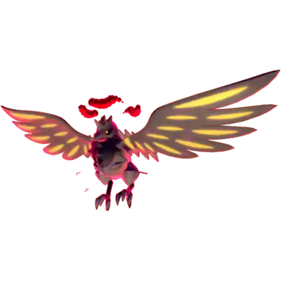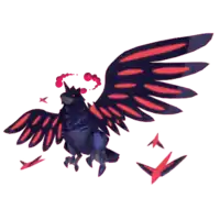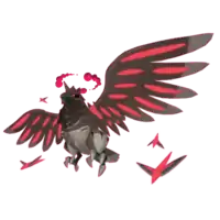 As Gigantamax Corviknight, it becomes larger with a slightly altered look. While Gigantamaxed, Corviknight's wings are streaked with glowing red patches of Dynamax energy, and its ruff of throat feathers is more robust. The plate on its breast and belly separates into two adorned plates, and the plates on its flanks become slashed, such that they resemble medieval puffed sleeves. Eight feathers called blade birds on the back of Gigantamax Corviknight's wings can be launched from its body to attack foes independently. Its blade birds also glow with Dynamax energy. In its Gigantamax form, Corviknight is powerful enough to generate hurricane-force winds. It can use its massive wings to hover in the air on updrafts created while Gigantamaxing. Its reinforced armor is barely affected by its opponent's attacks. [2]