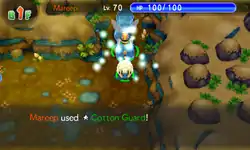 The cotton on the lower half of Cottonee's body puffs up and forms more cotton in front of it, creating a wall of cotton on the front of its body to protect itself against attacks; or, Cottonee pulls its body up a little bit and the cotton on its lower body puffs up and then comes out of its body, forming an orb of soft white cotton around it and protecting it from attacks. | ||