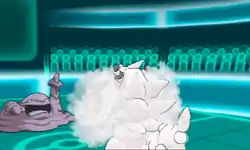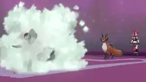 | Furfrou's body glows white, and puffs of cotton appear in around it. The puffs of cotton then disappear in a puff of smoke, and Furfrou glows blue, raising its defense. | |||