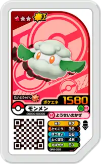 Cottonee (Japanese: モンメン Monmen) is a Grade 1 Pokémon Ga-Olé disk. It is part of the fifth Grand Rush set.