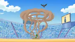 | Gastrodon uses Muddy Water to make a tornado made of water around it to avoid its opponent getting closer to it because it is slower. However, it will purposely leave an opening at the bottom of its body to entice opponents to strike there, so Gastrodon can counterattack in retaliation. | |||
