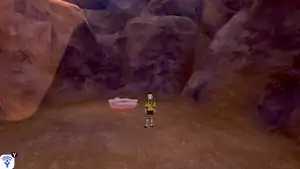 This den is down the slope on the left side where the path splits in multiple directions, coming from Challenge Beach. At the bottom, there are three dens. This one is to the left of the middle rock.