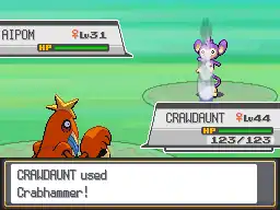 Crawdaunt hits the opponent with its claws. Sometimes, the pincers glow white before hitting it; or, one of Crawdaunt's pincers becomes surrounded by water and it hits the opponent with it. | ||