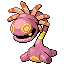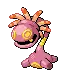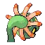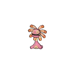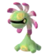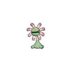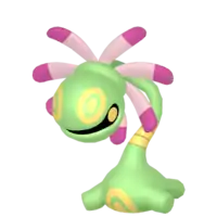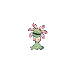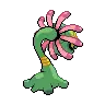 Cradily is a green, plantlike Pokémon with various yellow markings on its head, neck, and torso. There are circular, yellow eyespots on its head. However, its true eyes are concealed inside the dark, crescent opening on its head. Surrounding its head at the base are eight pink tentacles, which somewhat resemble flower petals. Its long, flexible neck has yellow bands in the center, and it can be extended to assist in capturing prey. Its body is short and squat with four stubby growths and a yellow, oval, target-like pattern on the chest.
