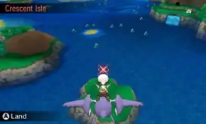 Crescent Isle (Japanese: 弓形の島 Crescent Island) is a Hoenn location first seen in Pokémon Omega Ruby and Alpha Sapphire. It is only accessible by soaring on LatiosOR or LatiasAS and is to the south of Ever Grande City. This crescent shaped island appears randomly at the start of the day or when it is received from passersby. In the center area of the Crescent Isle is a strange ring hovering in the air, through which the player can encounter Cresselia.