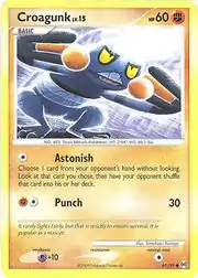 Croagunk (Japanese: グレッグル Gureggru) is a Fighting-type Basic Pokémon card. It is part of the Arceus expansion.