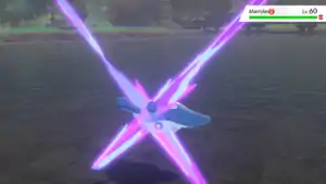Drapion crosses its arms above its head and its hands and pincers start to glow purple. Drapion then slashes the opponent in an 'X' formation, or Drapion crosses its arms in front of its face and its claws start to glow purple. A purple 'X' then appears in front of its crossed arms and it opens its hands, firing the 'X' at the opponent. | ||