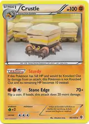 Sturdy is an Ability in the Pokémon games that Crustle can have. Stone Edge is a move in the games that Crustle can learn via TM71. This card's Pokédex entry comes from Pokémon Black 2 and White 2.