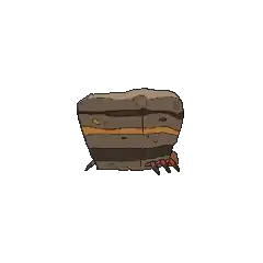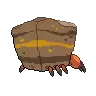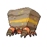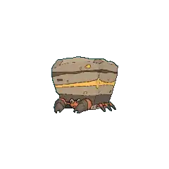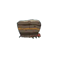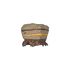 Crustle is an orange Pokémon resembling an insect or crustacean. Its most distinguishing feature is its enormous shell, which resembles a cut-away block of sediment with multiple layers and strata visible. The tips of its pincers and six feet are dark gray. It has two glaring yellow eyes. Crustle possesses a straight tail that is concealed underneath its shell.