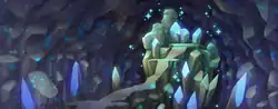 It is a cavern, with sharp rocks surrounding a central platform. There are shining specks in the distance.