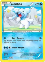 Cubchoo (Japanese: クマシュン Kumasyun) is a Water-type Basic Pokémon card. It was first released as part of the Furious Fists expansion.