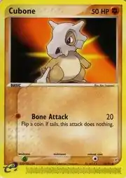 Cubone (Japanese: カラカラ Karakara) is a Fighting-type Basic Pokémon card. It is part of the EX Team Magma vs Team Aqua expansion.