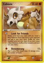 Cubone (Japanese: カラカラ Karakara) is a Fighting-type Basic Pokémon card. It is part of the EX Team Rocket Returns expansion.