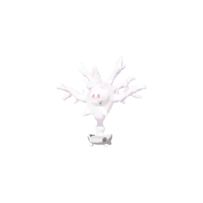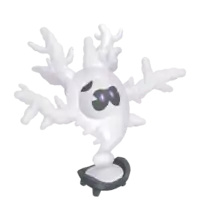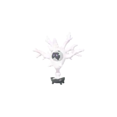 Cursola is a coral-like Pokémon. The lower body of Cursola resembles that of Galarian Corsola, albeit broken apart to reveal an ectoplasmic "body" which has taken the shape of a ghost. This ectoplasm surrounds Cursola's core, which is a white sphere with a face like that of Galarian Corsola, and has an oval-shaped opening with three inward-facing notches where the core is. Two half-circle openings similar to eyes are located above Cursola's core. Together, the three openings resemble a screaming face with a sad or pained expression. Two small branches below the core serve as its arms and one small branch on its forehead serves a horn. It has three long branches each on both sides of the head. It has three more branch spikes on its lower back. All of its branches can split apart when it attacks.