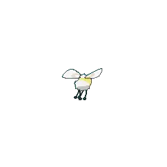 Cutiefly is a tiny Pokémon with a pair of comparatively large wings. It has a pale yellow body with a white face and tail. It has large eyes with spots resembling pixels in them, a long brown proboscis, and two tiny transparent tufts on its head resembling antennae. It has wide, flat white wings with a brown loop marking toward the bottom. In-between its wings is a white tuft of fuzz. It has four spindly legs with round feet.