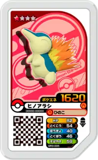 Cyndaquil (Japanese: ヒノアラシ Hinoarashi) is a Grade 1 Pokémon Ga-Olé disk. It is part of the third Grand Rush set.