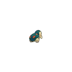 Cyndaquil is a small, bipedal Pokémon with bluish fur on top of its body and cream-colored fur on its underside. Its eyes are usually seen closed, and it has a long, thin snout. Its arms are short, but its legs are slightly more developed and have a single nail on each foot. On its back are four red circles that can erupt into flames. When the flames are burning, its back seems to be covered in spines. Cyndaquil is capable of defending itself using these flames, and the fire grows more powerful as it becomes angry or defensive. However, if it is tired, the flames are not able to burn properly. It is usually timid by nature and often curls into a ball when intimidated. Though rare in the wild, it can be found living on grasslands.