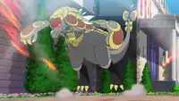 | Cynthia sent out Kommo-o to battle Alternate World Team Rocket, who were trying to steal Ash's Pikachu, breaking the electric nets they had fired.