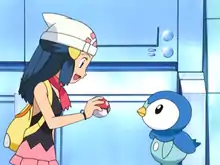 Dawn volunteers to find the missing Pokémon and soon finds Piplup, who runs off and gets into trouble with some Ariados. Though Dawn comes to the rescue, Piplup isn't exactly grateful. Once the angered Ariados return, however, Piplup and Dawn must work together in order to escape. They end up on the shore of Lake Verity, where they spot a mysterious Pokémon. Then, back at the lab, Dawn makes their partnership official and chooses Piplup to be her companion.