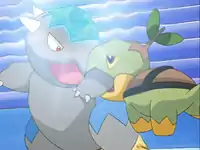 Ash decides that Pikachu needs to be recalled for now and sends out Turtwig. Ash begins with Razor Leaf, though Cranidos’s Flamethrower scorches through the leaves. Turtwig however is quick enough to dodge the Flamethrower and uses Bite on Cranidos' arm. Cranidos then uses Zen Headbutt and scores a direct hit sending Turtwig flying. Cranidos scores another direct hit on Turtwig with Flamethrower, causing major damage. Turtwig makes a quick recovery and sends out a Razor Leaf, scoring a knockout on Cranidos. Ash is thrilled with Turtwig’s efforts but doesn't allow himself to celebrate, knowing that he went through far too much to knock out only one Pokémon.