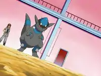 Finally, Roark sends out his best and newly evolved Pokémon: Rampardos. Aipom uses Swift, but it doesn't affect Rampardos at all. Rampardos makes a swift reply with Headbutt, taking Aipom out. Ash sends out Pikachu again. Ash tells Pikachu to use Thunderbolt, but Rampardos dodges and uses Zen Headbutt. Pikachu tries to jump away, but is hurt by the Zen Headbutt as he spins past. Pikachu then sprints into a Quick Attack. Rampardos is about to use Headbutt, but Pikachu jumps over it. Rampardos throws Pikachu off with its tail. Pikachu returns with an Iron Tail, colliding with Rampados' Zen Headbutt. The physical contact temporarily paralyzes Rampados, but its Mold Breaker Ability nullifies the status condition. Rampardos uses Zen Headbutt one more time and Pikachu is knocked out. Elsewhere, Croagunk's intimidating stare scares Team Rocket out of the Gym. Jessie thinks that Croagunk wants to join their team, but Croagunk Poison Jabs her. James and Meowth immediately pick her up and run away screaming.
