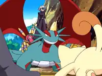 Jessie and James are spotted by J's minions and they make a run for it. As Ash and Aipom search for Pikachu, J and her Drapion appear and capture Ash. Aipom hits J's Drapion with Fury Swipes, freeing Ash from the scorpion's clutches. Ash sends out his Turtwig to assist Aipom in the battle. Drapion uses Poison Sting, but Aipom and Turtwig counter with Swift and Razor Leaf, but their attacks didn't damage the Ogre Scorpion Pokémon. Drapion hits Aipom and Turtwig with Cross Poison.
