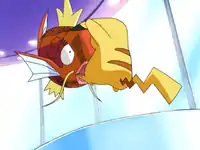 Pikachu fires Thunderbolt, but Magikarp jumps into the air and spins to dodge. It comes down with Tackle, and although Pikachu tries to dodge, Magikarp still hits, slamming Pikachu into the edge of the pool. Pikachu clings onto the edge before retaliating with Quick Attack. Magikarp meets it head on with Tackle, but Pikachu switches to Iron Tail. Both attacks hit and create an explosion, tossing both Pokémon into the pool. Pikachu gets back onto the island and Magikarp resurfaces, both exhausted.
