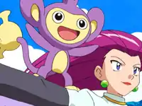 They hear Aipom crying and rush to find Aipom, spotting the Pokémon atop a precipice, trying to balance on a flat rock. They don't realize that she is Ash's Aipom and when Jessie sees Aipom cry she decides to save Aipom. She uses a log to form a bridge to the isolated rock. She walks across the log, seemingly calm and balanced. She gets close and grabs Aipom, but ends up jumping onto the rock Aipom was trying to get off. Ash's hat comes lose and flies with the wind back to Ash. Ash retrieves it but hears Aipom cry, prompting them to rush to the location. Jessie holds Aipom, trying to balance on the rock. Ash and his friends arrive and notice the situation as Jessie and Aipom lose their balance, sliding down the cliff similar to snowboarding. The two fly in the air and land on the grass, Aipom landing safely but Jessie crashing face-first. Aipom hugs up to Jessie as Ash and his friends approach. Team Rocket finds out Aipom is Ash's and Ash reluctantly thanks Jessie for saving Aipom. Jessie decides to use the situation to her advantage, wanting to use Aipom in the contest. Ash believes Aipom doesn't want to, but Aipom actually does, which Meowth seconds. Ash decides to let it happen, though reluctantly.